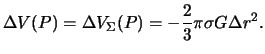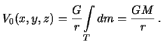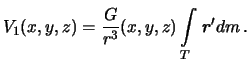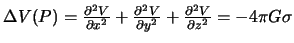 Таким образом: сила притяжения внутренней материальной точки со стороны масс сферического тела линейно растет по абсолютной величине с расстоянием от центра шара и направлена к его центру. Другими словами, закон Ньютона, или, как еще его называют, закон обратных квадратов, превращается в закон Гука -- закон прямой пропорциональности "упругой" силы от величины отклонения тела от положения равновесия. Нужно отметить, что если равномерно распределенная притягивающая масса занимает объем, ограниченный эллипсоидальной поверхностью, то и в этом случае вместо закона Ньютона следует брать закон Гука. Покажем теперь, что во внутренней точке гравитационный потенциал подчиняется закону Пуассона: Будем считать, что мы имеем дело с произвольным телом, ограниченным замкнутой поверхностью