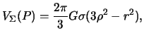 Гравитационный потенциал однородного шара во внешней точке ничем не отличается от потенциала шара, со сферически симметричным распределением массы, поэтому мы этот случай рассматривать не будем. Гравитационный потенциал однородного шара во внутренней точке может быть вычислен по формуле (3.9), в которой нужно положить плотность постоянной величине. Имеем