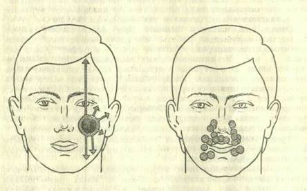 Рис. 17. Невралгия тройничного нерва. Если невралгии тройничного нерва свойственны изматывающие, изнуряющие боли, то паралич лицевого нерва — это остро развивающаяся тяжелая деформация лица. Как правило, паралич является следствием пребывания человека на сквозняке. Возникает спазм сосудов, питающих лицевой нерв, и лицевая мускулатура становится неподвижной. У больного человека лицо перекошено, глаз широко открыт даже во сне, угол рта безвольно свисает, рот становится похожим на лежащий на боку вопросительный знак. Медикаментозное лечение при этом заболевании назначает врач. Для успеха лечения больному следует выполнять специальные упражнения (см. ниже). Изменение выражения лица и особенно глаз часто служит проявлением нервно-психических заболеваний. Металлически-тусклый, малоподвижный взгляд страдающих эпилепсией описал профессор В. Ф. Чиж. Вообще глазам придается большое значение в диагностике заболеваний. Различные отделы мозга связаны с внутренними органами, и каждый из них имеет свое «представительство» в радужной оболочке глаза. Поэтому по глазам можно судить не только о настроении человека, но и о состоянии его здоровья. Иридодиагностика — диагностика по радужной оболочке глаз — метод древний, возрождающийся ныне благодаря возможностям, которые предоставляют медицине современные наука и техника. Парацельс, подходя с позиций астрологии, рассматривал глаз как микрокосмос, а человека в целом — как макрокосмос и считал, что любое влияние на организм индивидуума не может не отражаться в его глазах. При ухудшении здоровья цвет радужки меняется, иногда до коричневого. Чем гуще окраска радужки, тем благоприятнее наследственность и тем дольше проживет человек. Иридодиаг-носты выделяют на радужке тополабильные и топостабильные знаки (рис. 18). Тополабильные знаки — отложения пигмента вне связи с органными полями, обусловленные функциональными нарушениями. Топостабильные знаки располагаются в органных полях и связаны с заболеваниями органов. Перелом конечности в остром периоде проявляется черной полоской на радужке, а белая линия указывает на выздоровление (формирование костной мозоли). Грязно-серая окраска свидетельствует о лекарственном отравлении, кольцевые аномалии цилиарного пояса радужной оболочки — о ферментативных нарушениях (паталогия выработки пепсина, трипсина и др.). Большой цилиарный пояс говорит о нормальной трофике, волнистый — о неспокойном характере, воронкообразный — о склонности к обжорству. Кайма цилиарного пояса — зеркало кишечной микрофлоры и биосинтеза витаминов. Наличие диффузных красноватых островков на радужке указывает на уменьшенное выделение гормонов гипофиза и на перерождение сосудистой стенки, локальное углубление каймы — на сужение просвета кишечника, локальные выступы — на расширение его отдельных участков. Узкая кайма цилиарного пояса отражает малый объем желудка, широкая — большой. Отсутствие каймы есть проявление слабости вегетативной нервной системы. Впрочем, многие врачи отрицают иридодиагностику, считая ее забавой для дилетантов.