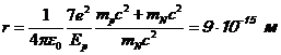 Синтез тяжелого ядра из более легких происходит при сближении их на расстояние порядка радиуса адронного взаимодействия. Сближению препятствует сила кулоновского отталкивания положительно заряженных ядер. Для того, чтобы преодолеть силу отталкивания, надо сообщить одной из частиц, или обеим, достаточную кинетическую энергию. Задача 5. Критическое расстояние, на которое должны сблизиться ядра тяжелого водорода, чтобы стала возможной реакция Решение. При сближении ядер дейтерия увеличивается их потенциальная кулоновская энергия. На расстоянии r потенциальная энергия равна Если одно из ядер покоится, то вся система двух частиц имеет импульс. Центр масс движется. Кинетическая энергия центра масс не может перейти в потенциальную энергию сближения. Кинетическая энергия налетающей частицы должна превосходить энергию в системе центра масс. Один из способов решения может быть таким. Найденная потенциальная энергия значительно меньше энергии покоя ядер, поэтому можно воспользоваться класическими расчетами. Если p - импульс налетающей частицы, то кинетическая энергия налетающего ядра в системе центра масс равна