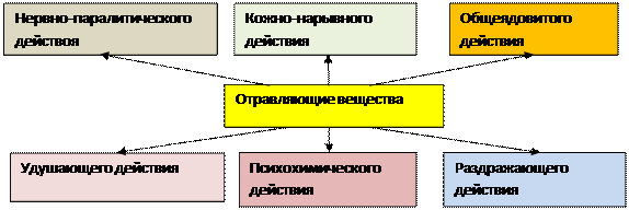 Отравляющие вещества (ОВ) составляют основу химического оружия. Находясь в боевом состоянии, они поражают организм человека, проникая через органы дыхания, кожные покровы и раны от осколков химических боеприпасов. Кроме того, человек может получить поражение в результате употребления зараженных продуктов питания и воды, а также при воздействии ОВ на слизистые оболочки глаз и носоглотки. ОВ нервно — паралитического действия (GA — табун, GB — зарин, GD — зоман, VX — Ви-Икс), поражают нервную систему через органы дыхания, при проникновении в парообразном и капельно-жидком состоянии через кожу, а также при попадании в желудочно-кишечный тракт вместе с пищей и водой. Стойкость их летом — более суток, зимой — несколько недель и даже месяцев. Признаки поражения: слюнотечение, сужение зрачков (миоз), затруднение дыхания, тошнота, рвота, судороги, паралич. ОВ кожно — нарывного действия (H — технический иприт, HD — перегнанный иприт, HT и HQ — ипритные рецептуры, HN — азотистый иприт), обладают многосторонним поражающим действием. В капельножидком и парообразном состояниях поражают кожу и глаза, при вдыхании паров — дыхательные пути и легкие, при попадании в организм с пищей и водой — органы пищеварения. Характерная особенность иприта — наличие периода скрытого действия (поражение выявляется не сразу, а через 2 ч и более). Признаки поражения: покраснение кожи, образование на ней мелких пузырей, которые затем сливаются в крупные и через двое-трое суток лопаются, переходя в трудно заживающие язвы. ОВ общеядовитого действия (АС — синильная кислота, СК — хлорциан), поражают человека только при вдыхании им воздуха, зараженного их парами. Признаки поражения: металлический привкус во рту, раздражение в горле, головокружение, слабость, тошнота, резкие судороги, паралич. ОВ удушающего действия (CG — фосген), воздействуют на организм через органы дыхания. Признаки поражения: сладковатый 509.07, неприятный привкус во рту, кашель, головокружение, общая слабость. После выхода из очага заражения эти явления проходят, и пострадавший в течение 4-6 ч чувствует себя нормально. В этот период развивается отек легких. Затем может резко ухудшиться дыхание, появятся кашель с обильным выделением мокроты, головная боль, повышенная температура, одышка, участится сердцебиение. ОВ психохимического действия (BZ — Би-Зет), действуют на центральную нервную систему и вызывают психологические (галлюцинации, страх, подавленность) или физические (слепота, глухота) расстройства. ОВ раздражающего действия (CN — хлорацетофенон, DM — адамсит, CS —Си-Эс, CR — Си-Ар), вызывают жжение и боль во рту, горле и в глазах, сильное слезотечение, кашель, затруднение дыхания.