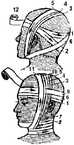 Бинтовые повязки головы и шеи 1. Головная повязка «шапочка «— полоска бинта приблизительно 70 см длиной опущена с темени вниз перед ушами. Концы бинта держит сам раненый или же помощник. Вокруг этой полоски, вокруг головы, накладываются круговые ходы бинта до тех пор, пока не будет перевязана вся голова, причем каждый круговой ход закрывает часть наложенной свободно полоски бинта.