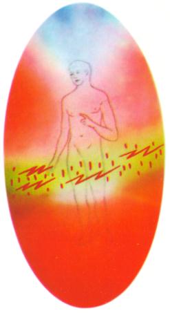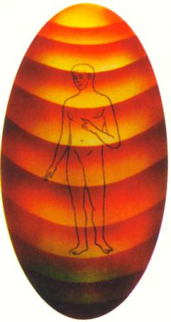 Рассмотрим, как некоторые типы характера человека выражаются на уровне более тонких тел. Хороший пример — случай раздражительного человека. Одной из доминирующих характеристик его астрального тела обычно бывает яркая темно-красная полоса, как это видно на илл. 12. Но то, чем оно особенно отличается от астральных тел других людей, — это маленькие ярко-красные пятна, подобные восклицательным знакам, распределенные по всему телу. Эти пятна появляются как следы легких вспышек раздражения по поводу обычных забот повседневной жизни. Каждый раз, когда раздражительный человек дает выход своим чувствам, сердито крича по любому поводу — когда кофе, например, остыл, или он опаздывает на поезд, или его ребенок опрокинул на стол пузырек с чернилами, — маленький ярко-красный проблеск укажет на неконтролируемую эмоцию.