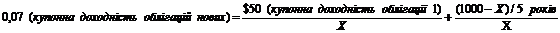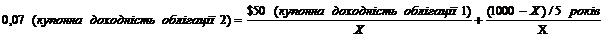 Х дорівнюватиме 1087 дол. США, тобто інвестор матиме збитки у 87 дол. США на кожній облігації. Її купонна доходність складатиме