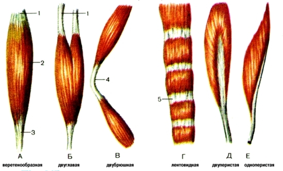 Мышцы, как орган: Мышцы, как любой орган имеет специфическую форму, определённую конструкцию и выполняет определённые функции. В состав мышцы входят мышечная ткань, рыхлая и плотная соединительные, сосуды и нервы. Мышечная ткань, формирующая тело мышцы состоит из мышечных волокон, обусловливающих способность мышцы сокращаться и расслабляться. В мышечных волокнах находится большое количество миофибрилл, каждая из которых состоит из двух белков: актина и миозина. Рыхлая соединительная ткань образует мягкий скелет мышцы, от которого начинаются волокна, а плотная – сухожильные концы мышц. ⅓ мышц крепится к костям, а ⅔ на соединительнотканные образования. Мышца: 1) брюшко или тело (активно сокращающаяся часть мышцы). 2 ) концы или сухожилия (при их помощи мышца крепится к костям) Классификация мышц:. 1) По форме