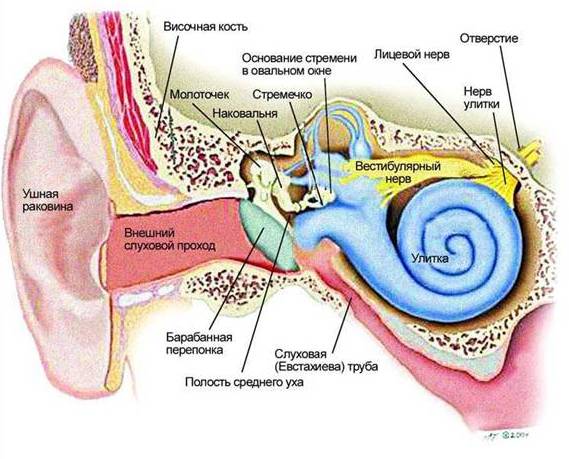 А) ушная раковина, выполняет следующие функции: - локаторную – собирает звуковую волну - «пульт управления» - точки на раковине связаны с внутренними органами - эстетическую Б) наружный слуховой проход – проводит звуковую волну, в стенках имеются железы, выделяющие серу, к которой прилипают частицы пыли. Рост эпителия идет кнаружи и пыль удаляется из прохода. Травмы ушной раковины и «пробки» в слуховом проходе снижают слух. 2. Среднее ухо – полость, образованная костями черепа и заполненная воздухом, в нем имеются: А) барабанная перепонка, которая энергию звуковой волны переводит в энергию колебательных движений (механическую) и передает ее на слуховые косточки. При разрыве барабанной перепонки ухудшается слух. Б) слуховые косточки: молоточек, наковальня, стремечко, которые эту механическую энергию, усиливая, передают на перепончатый лабиринт внутреннего уха через овальное окно в костном лабиринте внутреннего уха. При воспалительных процессах подвижность косточек снижается и мы хуже слышим. В) слуховая или евстахиева труба, которая полость среднего уха соединяет с полостью носоглотки. Через нее возможно проникновение инфекции из носоглотки в среднее ухо, что приводит к воспалению среднего уха – отиту. Стенки трубы спадаются и давление в полости среднего ухо изменяется. Когда рот широко открыт, то давление в полости такое - же как в окружающей среде и при резких звуках барабанная перепонка не разрывается. 3. Внутреннее ухо – костный лабиринт, в нем перепончатый, заполненный жидкостью - эндолимфой. Лабиринт состоит из 3-х частей: улитки, преддверия и полукружных каналов. Органом слуха является нижняя часть – улитка. В ней расположены волосковые клетки – слуховые рецепторы, на них лежит мембрана. Стремечко стучит в перепончатый лабиринт через овальное окно и вызывает колебание жидкости. Жидкость давит на мембрану, мембрана – на волосковые клетки – рецепторы. Они эту механическую энергию преобразуют в энергию нервного импульса, который по слуховому нерву поступает в слуховую зону коры больших полушарий, расположенную в височных долях.
