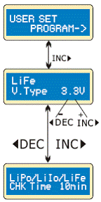 Экран отображает номинальное напряжение литиевой батареи. Существует три типа литиевых батарей: литий-железные (3,3В), ионно-литиевые (3,6В) или литий-полимерные (3,7В). Это очень важно, поэтому Вам необходимо тщательно проверить батарею и правильно задать её напряжение. Если оно отличается от правильного значения, батарея может взорваться в процессе зарядки.