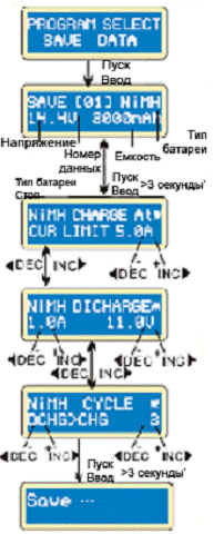 Для Вашего удобства продукт В6АС имеет программу хранения и загрузки данных. Устройство может хранить в памяти данные 10 батарей, представляющие собой соответствующие технические характеристики батарей. Вы можете запросить данные во время зарядки или разрядки, не настраивая всю программу заново. Чтобы экран начал мигать, нажмите кнопку START/ENTER и используйте INC или DEC для настройки параметров.