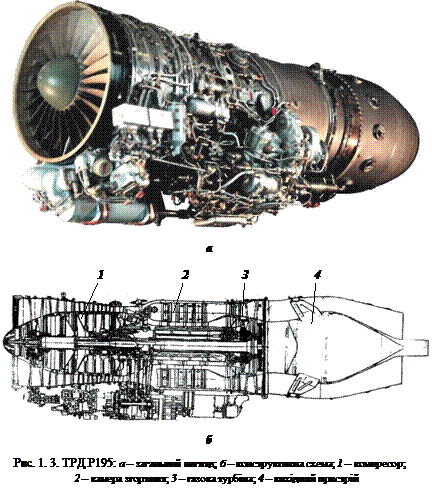 Принцип роботи ГТД у польоті літака складається з безперервного здійснення таких процесів (повного термодинамічного циклу): 1) перетворення у вхідному пристрої 2 силової установки літака (ГТД) швидкісного напору повітряного потоку, що набігає 1, на тиск і подача його до компресора 3; 2) стискання повітряного потоку в компресорі 3 та подача стиснутого повітряного потоку до камери згоряння 4; 3) нагрівання стиснутого повітряного потоку в камері згоряння 4 шляхом спалювання хімічного палива – перетворення хімічної енергії палива на теплову енергію газового потоку 7 та подача його до газової турбіни 5 (зворотного компресора); 4) розширення газового потоку в газовій турбіні 5 та подача його у вихідний пристрій силової установки (ГТД) 6; крім того, механічна робота, яка створюється газовою турбіною 5 витрачається на обертання компресора 3 та агрегатів різних систем літака; 5) перетворення у вихідному пристрої 6 силової установки (ГТД) створеного теплового перепаду газового потоку 7 в кінетичну енергію спрямованого руху літака. Таким чином, повітряний потік, що подається в ГТД, отримує в камері згоряння теплову енергію та розганяється. У результаті силового впливу газового потоку на проточні частини елементів ГТД створюється реактивна сила – тяга двигуна, спрямована паралельно його осі в бік, протилежний газового потоку. При цьому повітряний потік, що обтікає ГТД зовні, створює руху аеродинамічний опір. Тяга двигуна при цьому зменшується на величину зовнішнього опору. Частина тяги, що залишалась, називається ефективною тягою силової установки (ГТД) та використовується як рухома сила літака в просторі. Вхідний пристрій силової установки літака (може належати як планеру літака, так і ГТД) являє собою складну систему і містить: повітрозабірники; канали, що підводять повітряний потік до ГТД; впускні і протипомпажні стулки; пристрої відсмоктування чи зливу прикордонного шару; пристрої автоматичного керування та ін. Головним елементом вхідного пристрою силової установки літака (ГТД) є повітрозабірник, призначений для подачі повітряного потоку з вищим повним тиском і рівномірним, без значних пульсацій, полем швидкостей повітряного потоку. Зменшення втрат повного тиску та підвищення стійкості роботи повітрозабірника в нерозрахункових умовах польоту літака досягаються зміною геометричних параметрів каналу підведення повітряного потоку. Компресор ГТД – це лопаткова машина для здійснення механічного стискання й підвищення повного тиску повітря, яке подається в камеру згоряння. Він забезпечує протікання через двигун великої маси повітря, створюючи умови для автономного зльоту й розгону літака. Уздовж каналу компресора швидкість зменшується та на виході з нього становить приблизно половину від швидкості повітряного потоку на вході. Камера згоряння ГТД являє собою генератор тепла, для одержання якого використовують вуглеводне паливо (авіаційний гас). Хімічна енергія, що міститься в паливі, перетворюється при окисленні на тепло. Реакція має ланцюговий характер зі створенням продуктів згоряння і виділенням тепла. Газова турбіна ГТД – це лопаткова машина, що перетворює потенційну енергію стислого і підігрітого газу на механічну енергію на валу, яка витрачається на обертання компресора і вентилятора ГТД та інших агрегатів, що забезп