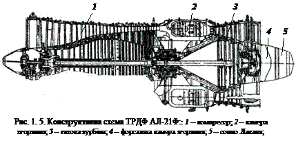 Як зазначалося раніше, у ТРД корисна робота, отримана в результаті здійснення в ньому термодинамічного циклу, витрачається на розгін потоку, що протікає усередині двигуна та на створення тягової роботи. У ТРДФ забезпечується значне підвищення температури газу перед вихідним пристроєм і збільшується швидкість витікання газу з вихідного пристрою для короткочасного збільшення тяги (рис. 1.4 і 1.5).