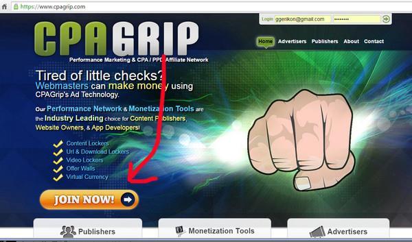 Попадаем на следующую страницу и тут надо чтобы вверху вправо было выбрано зелёным Publishersи нажимаем красную кнопку Join CPAGrip