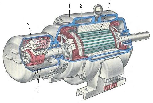 На рис. 2.6 приведен вид асинхронной машины с короткозамкнутым ротором в разрезе: 1 – станина, 2 – сердечник статора, 3 – обмотка статора, 4 – сердечник ротора с короткозамкнутой обмоткой, 5 – вал.