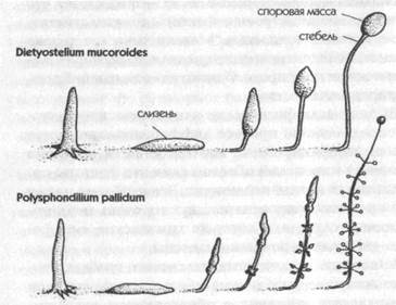 Рис. 4. Миграционная и кульминационная стадии двух видов плесневых грибков. Слева показаны вновь развившиеся сложные организмы, образованные агрегацией множества свободно живущих амебоидных клеток. Они мигрируют как «слизни» и затем растут вверх, дифференцируясь в стебли, несущие тела спор (Bonner, 1958)