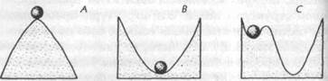 Современное понимание структуры химических систем зависит от представлений квантовой механики и электромагнетизма; гравитационные эффекты незначительны, и ими можно пренебречь. Возможные способы соединения атомов друг с другом даются известным из квантовой механики уравнением Шредингера, которое позволяет рассчитывать орбитали электронов на языке вероятностей; в квантовой теории поля вещества эти орбитали могут рассматриваться как структуры в электрон-позитронном поле. Но поскольку электроны и ядра атомов несут электрический заряд, они также связаны с пространственными структурами электромагнитных полей и, следовательно, с потенциальными энергиями. Не все возможные пространственные сочетания данного числа атомов имеют одинаковую потенциальную энергию, и только сочетание с наименьшей потенциальной энергией будет стабильно по причинам, указанным на рис. 6. Если система находится в состоянии с энергией большей, чем в возможных альтернативных состояниях, любое малое смещение (например, из-за теплового возбуждения) приведет к ее переходу в другое состояние (А). Если, с другой стороны, она находится в состоянии с энергией меньшей, чем в возможных альтернативных состояниях, после небольшого смещения она вернется в это исходное состояние, которое будет стабильным (В). Система может также временно находиться в состоянии, которое не является наиболее стабильным до тех пор, пока она не сдвинута выше «порогового» уровня (С); когда это случается, она переходит в более стабильное состояние с меньшей энергией. Эти энергетические соображения определяют, какое состояние химической структуры является наиболее стабильным, но они не объясняют пространственные характеристики этого состояния; эти характеристики представлены на рис. 6 как линии, по которым катится шарик и которые действуют как барьеры, ограничивающие его движение. Эти барьеры зависят от пространственных структур, образуемых полями вещества и электромагнетизма. Согласно второму закону термодинамики, спонтанные процессы в закрытой системе стремятся к состоянию равновесия; когда это происходит, изначальные различия в температуре, давлении и т. д. между различными частями системы стремятся к нулю. На техническом языке энтропия изолированной макроскопической системы либо остается постоянной, либо возрастает. Значение этого закона в популярных изложениях часто преувеличивается; в частности, термин «энтропия» употребляется как синоним «беспорядка». Тогда возрастание сложности организации, происходящее в процессе эволюции и развития живых организмов, оказывается противоречащим принципу возрастания энтропии. Это затруднение возникает из-за непонимания границ применения науки термодинамики. Во-первых, он применим только к закрытым системам, тогда как живые организмы — это открытые системы, обменивающиеся с окружающей средой веществом и энергией. Во-вторых, он имеет дело только с внутренними отношениями между теплом и другими формами энергии: он применим к энергетическим факторам, которые влияют на химические и биологические структуры, но не объясняет возникновения этих структур. И в-третьих, техническое определение энтропии слабо связано с каким-либо нетехническим понятием беспорядка; в частности, оно не имеет отношения к порядку того типа, который сущ