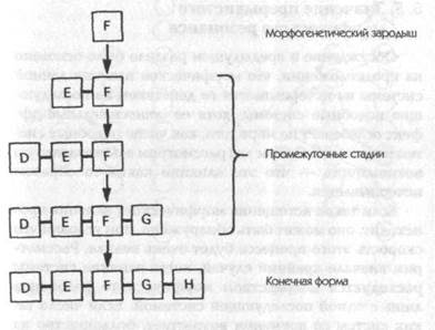Рис. 15. Диаграмма, представляющая стадии агрегативного морфогенеза морфической единицы D-E-F-G-H из морфогенетического зародыша F