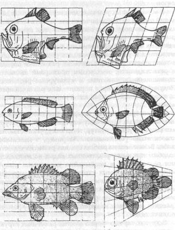 В некоторых случаях морфологическое расхождение затрагивает лишь одну определенную структуру или малую группу структур, тогда как другие остаются относительно устойчивыми. Например, в маленькой рыбке Beloneacus на ранних стадиях развития челюсти подобны таковым у родственных видов, но впоследствии развиваются в необычайно удлиненное рыло[171]. Множество различных структурных преувеличений развились под влиянием сексуального отбора, например рога у оленя. А цветы дают тысячи примеров расхождений в развитии различных составных частей: сравните, например, модификации лепестков у разных видов орхидей. В других случаях форма многих различных структур меняется сходным образом. Если формы варьируются особенно единообразно и гармонично, их можно сравнивать графически, по систематическому искривлению наложенных координат (рис. 20), как показал сэр Д'Арси Томпсон в разделе своего очерка «О росте и форме», озаглавленном «Теория трансформаций, или сравнение родственных форм». Эволюционные изменения такого типа происходят в рамках уже существующих морфогенетических полей. Они создают вариации на данные темы. Но они не могут объяснить существование самих этих тем. По словам Томпсона: