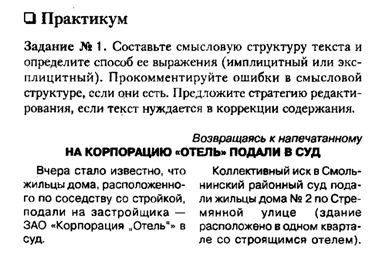 Ответ: 1) Заголовок текста довольно простой, но при этом передает суть основной мысли. Он конкретный, понятно сформулированный и не противоречит содержанию текста. 2) Основная мысль текста заключается в том, что жители города Смольнинск подали иск на застройщика корпорация «Отель». Жители аргументируют свой поступок, тем, что строительство не соответствует принятым нормативам и тем самым подвергает людей опасности. 3) Элементы общего содержания. Тезисы: 1)Возведение ТП противоречит всем медицинским и строительным нормам. 2)Не соблюдаются меры безопасности при строительстве, которое ведется рядом с газовой магистралью. 4) Текст относится к имплицитному способу выражения. Информация в тексте явно не выраженная, читатель сам домысливает и оценивает текст.