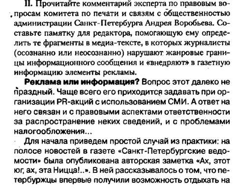 Ответ: Памятка для редактора – 1) Прежде всего, редактор должен помнить, что такое реклама и информация. Реклама (по Гундарину) - это информация, распространенная любым способом, в любой форме и с использованием любых средств, адресованная неопределенному кругу лиц и направленная на привлечение внимания к объекту рекламирования. Информация - это сведения об окружающем мире (объекте, процессе, явлении, событии), которые являются объектом преобразования (включая хранение, передачу и т. д.) и используются для выработки поведения, для принятия решения. 2) Также норма права запрещает, использование печатной продукции не рекламного характера для формирования и поддержания интереса к продавцам без надлежащего предварительного сообщения об этом (Статья 4, п.1, абз. 2 закона о рекламе) 3) Нельзя взимать плату за размещение рекламы под видом информационного, редакторского или авторского материала (ст 5, п.1, абз 4 закона о рекламе) 4) Необходимо выявлять цель публикации, если ее целью является просто информирование аудитории, то такой материал считается не рекламным. 5) Распространитель несет полную ответственность за опубликованный материал, содержащий признаки имиджевой рекламы. 6) (Из текста)Информация должна быть абсолютно достоверна и корректна, не затрагивать интересы других фирм. Лучше если статья не содержит оценочных эпитетов (изумительная фирма, великолепная продукция и т.п.). Они привносят в текст колорит рекламы. 7) Также редактор должен помнить об информационном поводе. Задание 12 Задание: Грамотно охарактеризуйте каждую логическую ощибку. 1) Апокалипсис не состоялся. Нарушение закона тождества.Закон тождества заключается в том, что каждая мысль текста при повторении должна иметь определенное, устойчивое содержание. То есть в нашем случае заголовок текста никак не пересекается с основным содержанием, где говорится про небесное явление, которое никак не влияет на здоровье и жизненную активность. По мнению заголовка, в тексте должно описываться о пережившем людьми конце света, а в тексте описано о совсем другом. Поэтому либо надо менять заголовок, в котором будет говориться о небесном явлении, либо менять содержание текста. Алогизм – контактный. 2) Живи, радуй дубленками. В данном тексте также нарушен закон тождества, между заголовком и основным текстом. В тексте можно просто поменять заголовок (Романовские овцы на грани вымирания). Алогизм – дистантный. 3) Человек взял буйвола за рога. Алогизм – дистантный. В этом тексте явно нарушен закон противоречия, так как при схватке с буйволом, человек схватил его за рога, тем самым поединок закончился вничью, но вот дальше сообщается, что герой поединка находится на излечении в больнице от многочисленных ушибов. Если бой закончился вничью, значит никто не пострадал, соответственно никто не получал тяжелых ушибов 4) Кому мешала мойва. Алогизм – дистантный. В этом тексте нарушен закон достаточного основания. Основная мысль текста заключается в пресечении контрабанды, а незаконный вывоз мойвы является вторичной идеей текста. Следует отметить, что заголовок не соответствует тексту. 5) Игры бывают разные. Алогизм контактный. Неверно проведена классификация понятий по разным основаниям, нужно выбрать одну классификацию. Задание 13 Отредактируйте композицию текста, обратив особое внимание на с