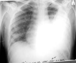 $$$003 Науқас 28 жаста, 1,5 жұма бұрын дене температурасы 38,6 С дейін көтеріліп жіті ауырып қалды, құрғақ жөтел, дем алғанда кеуде жасушасының сол жақ бөлігінде қатты ауырсыну бар. Кеуде қуысы ағзалары рентгенограммасында жоғарғы қисық контурымен сол жақ өкпе шеттеріне дейін, гомогенді субтотальды қарайған анықталды, көкірек мүшелері оңға ығыстырылған.
