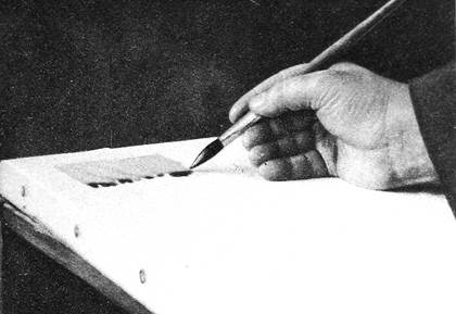 Косая штриховка разбивает краску на мелкие капли, не даёт собираться в большую массу, даёт возможность избежать потёков и освобождает от риска залить работу краской. Ещё до прикосновения кистью к бумаге важно строго проверить собственное представление о предмете. Рисунок требует сосредоточенности, дисциплины, выдержки. Необходимо иметь несколько кистей: широкие – для больших фоновых покрытий; для мелких деталей нужно иметь тонкие, острые кисти; мягкие – для лёгких лессировок. Также нужны кисти плоские и круглые. Разнообразие кистей будет способствовать целесообразной, живой технике. Место и материалы для работы подготавливают заранее. Бумагу натягивают на планшет, смочив его предварительно водой с помощью губки или ваты. Важно следить за тем, чтобы при высыхании на бумаге не появились волнистые поверхности. Планшет с бумагой устанавливают под углом 20-30 градусов. Воду, краску, кисти располагают справа, слева – тряпочку для вытирания кисти. Перед работой рекомендуется бумагу слегка смочить водой. Краски нужно развести в количестве, необходимом для всей работы и такой насыщенности, при которой на бумаге после прокладки получался бы слабый светлый тон. Количество краски на кисти должно быть таким, чтобы она ложилась на бумагу ровно, не оставляя случайных пятен. Начинать необходимо с верхнего края листа равномерно, однообразным движением кисти под углом 45-70 градусов к горизонтальному краю планшета. Следите за тем, чтобы нижняя кромка наносимого красочного слоя была насыщена раствором краски. Вторично покрывать отмываемое изображение можно лишь по просохшему предварительному слою. Излишки раствора краски снимают отжатой чистой кистью.