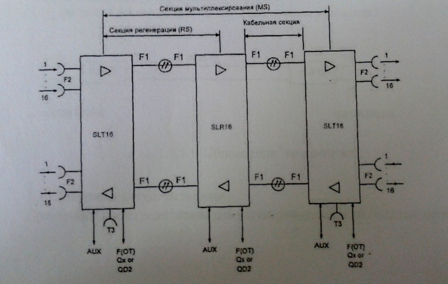 На рис 1 приведена структура двунаправленного тракта передачи, организованного на базе оборудования SL16. Для передачи сигналов STM-16 в соответствии с Рекомендацией G.957 МСЭ-Т используется линейный код NRZ (без возврата к нулю) со скремблированием. В линейном регенераторе входной оптический сигнал преобразуется в электрический, усиливается, регенерируется и преобразуется обратно в оптический сигнал. Линейный регенератор обеспечивает доступ к каналу служебной связи и дополнительным вспомогательным каналам передачи данных секции регенерации В диапазоне 1300 нм допустимое затухание в оптическом кабеле секции регенерации составляет 25 дБ, а в диапазоне 1550 нм — 27.5 дБ.Между двумя оконечными пунктами допускается размещать до 48 регенераторов SL16. При этом суммарная величина фазового дрожания не превышает допустимого значения. Тракты передачи с большей длиной могут быть организованы путем каскадного включения секций регенерации, на концах которых включено линейное оконечное оборудование.