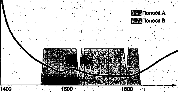 Разреженные системы WDM, как указано выше, — это системы CWDM, использующие разреженную сетку длин волн — 20 нм. Они были предложены как дешевая замена более дорогих систем DWDM в случае, когда требуется не более 16—18 каналов WDMM. Впервые они стали применяться в городских сетях, или сетях класса "метро", как их классифицируют в англоязычной литературе (т.е. сетях MAN — MetropolitanAreaNetwork, бывший стандарт IEEE 802.6). Такой класс систем WDM стал возможным после того, как удалось убрать (или значительно уменьшить) гидроксильный, или "водяной", пик на кривой затухания в районе 1383 нм. В соответствии с рек. G.694.2 предлагается использовать до 18 несущих с шагом 20 нм: 1271, 1291, 1311,... 1571, 1591, 1611, т.е. общая ширина полосы, требуемая для них, составляет 340 нм. Естественно, что затухание на краях такого широкого диапазона длин волн достаточно велико, Особенно на его левом крае. Поэтому, если ориентироваться, например, на стандартное ОМ ОВ, то можно сказать, что при плохо выровненном по затуханию полном диапазоне его обычно ограничивают до уровня 140лнм (1471—1611 нм) с числом несущих 8. Ясно, что если требуется использовать больше несущих, то, оставаясь в рамках систем CWDM, мы имеем, согласно стандарту, еще 200 нм полосы, или 10 дополнительных каналов с шагом 20 нм. Альтернативой является возврат к системам DWDM, что дорого и приведет к потере уже вложенных в систему CWDM средств. Другая альтернатива, не приводящая к потере вложенных средств, — использовать гибридную модель частотного плана, позволяющую объединить частотные планы CWDM и DWDM, а значит и преимущества обеих систем: дешевизну первой и масштабируемость (возможность роста) второй 4.1.5.3. Гибридная модель частотного/волнового плана Для простоты рассмотрим DWDM с шагом частотного плана 100 ГГц и CWDM, использующим 8 каналов в диапазоне 1471—1611 нм. На рис.5приведены оба плана с указанием пересекающейся области длин волн. В верхней части рисунка показан план DWDM с шагом 0,8 нм (полоса С) и пересекающаяся область, в нижней — план CWDM с шагом 20 нм, а на нем позиции полос С и L частотного плана DWDM. Известно, что полоса С включает длины волн в диапазоне 1528,77— 1560,61 нм, а полоса L — в диапазоне 1566,31-1612,65 нм. В эти полосы попадают следующие 5 несущих волнового плана CWDM: 1531,1551,1571,1591 и 1611 нм. С другой стороны, в полосе пропускания фильтра одной несущей CWDM может разместиться 8 несущих DWDM из полосы С. Отсюда напрашивается самый простой метод формирования гибридного частотного плана и первая стратегия расширения числа несущих. а) использовать волновой план CWDM для 8 несущих (1471-1611 нм); б) при необходимости расширения числа каналов один из каналов CWDM заменить на 8 каналов DWDM.