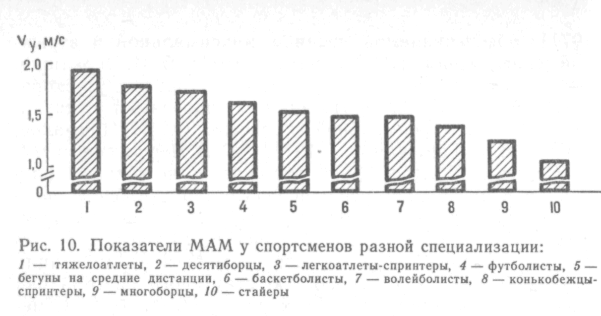 ной специализации (табл. 1) соответствуют и более высокие значения взрывной J и стартовой Q силы мышц, мощности работы /V и времени достижения максимума взрывного усилия Fmax. Подчеркивается, что МАМ (как стартовый источник энергообеспечения) и максимальная сила мышц — важные показатели специальной работоспособности конькобежцев-спринтеров (В. Г. Половцев, Г. М. Панов, 1977; О. С. Быховская, Т. Г. Шаблова, 1981). Выявлена однонаправленная динамика МАМ (по тесту R. Margaria) и результата вертикального прыжка с места (рис. 11) в подготовительном периоде тренировки высококвалифицированных баскетболистов (В. А. Данилов и др., 1980). Показано, что уровень МАМ обнаруживает связь с максимальной скоростью спринтерского бега (Н.И.Волков и др., 1972), а результат последнего, в свою очередь, существенно связан со скоростно-силовыми показателями спортсменов (В.Г.Семенов, 1971;