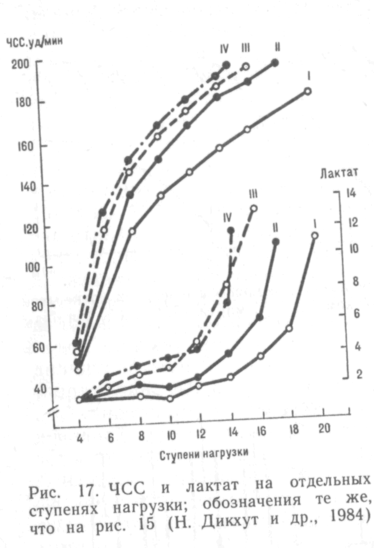 к меньшему привлечению гликолитического источника и достигается специальной тренировкой. Интересны в этом отношении сравнительные данные обследования футболистов ФРГ I и II федеральных лиг (в первую из них входили три игрока национальной сборной) и легкоатлетов — бегунов на средние дистанции — членов национальной сборной и региональных клубов (Н. Дикхут и др., 1984). Очевидны различия этих контингентов по скорости бега и ЧСС на уровне ПАНО (рис. 15), а также по относительному потреблению кислорода и концентрации лактата при максимальной нагрузке (рис. 16). Особенно заметна разница в их подготовленности в условиях выполнения ступенчатой нагрузки; бег на тредбане, начиная со скорости 6 км/час и повышая ее через 3 мин на 2 км/час до субъективного утомления (рис. 17). Заметим, что у высококвалифицированных представителей игровых видов спорта объем сердца, ритм сердечных сокращений, его вариативность и индекс напряжения миокарда в среднем не имеют достоверных отличий от аналогичных показателей у представителей циклических видов спорта. То же относится и к амплитудам систолического и диастолического колебательного циклов, их продолжительности, продолжительности механической систолы и величины силового показателя (В. В. Васильева, 1982). Отсюда более высокая работоспособность бегунов в условиях тестирования на тредбане может быть объяснена только лучшей приспособленностью их мышц к высокому аэробному обмену энергии. И поскольку мышцы футболистов в меньшей мере обладают такой способностью, то в них преждевременно и более интенсивно образуется лактат. Увеличение его концентрации в крови ведет к быстрой утомляемости и снижению скоростных способностей спортсменов. Тренировка в видах спорта с переменным режимом работы способствует выраженной гипертрофии миокарда и увеличению объема сердца (В. Л. Карпман и др., 1978; В. Н. Кузьмина и др., 1976; А. Г. Дембо, 1980). Однако важно обратить внимание на следующее. Клинические обследования показали, что в видах спорта с переменным режимом нередки случаи, когда интенсивность тренировочной нагрузки не соответствует подготовленности спортсмена. Отсюда хронические физические перенапряжения приводят к дистрофическим изменениям миокарда. Интересно, что наибольшее число таких случаев приходится на перворазрядников и мс, причем наибольший процент наблюдается у футболистов (Б. Д. Кос-тылева, Г. С. Рябченко, 1976). Такая тенденция легко объясняется. Спортсмены, достигшие уровня I разряда и мс, как правило, резко повышают интенсивность тренировки без учета уровня функциональной подготовленности организма. Что касается футболистов, то причину следует искать в недостаточном внимании к СФП за счет увлечения игровыми формами тренировки высокой интенсивности, что уже неоднократно отмечалось (В. Н. Кузьмина и др., 1976; М. А. Годик, 1984; Е. В. Скоморохов и др., 1985; Л. Ф. Муравьева и др., 1984). В результате они оказываются неподготовленными к интенсивным нагрузкам в соревновательном периоде. Таким образом, планомерное развитие специальной выносливости, предусматривающее сбалансированную подготовку ССС и совершенствование способности мышц к аэробному обмену энергии, как условие повышения скоростных способностей является важнейшей задачей СФП в видах спорта с переменным режимом. Как мы уже говорили выше, особую группу сост