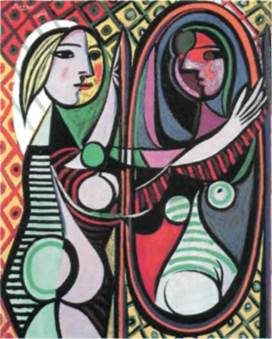 8. Пабло Пикассо. Девушка перед зеркалом. 1932 г, март. Холст, масло. 162,3 х 130,2 см. Музей современного искусства, Нью-Йорк (дар г-жи Саймон Гуггенхайм) эффекта почти воздушной прозрачности в пейзаже, образующем задний план картины и выписанном динамичными, изящными мазками. Цвет сам по себе настолько выразителен, что его воздействие на зрителя не зависит от какой-то определенной системы. Картина Пикассо «Девушка перед зеркалом» (илл. 8) строится на мощно ак центированных контурах, подчеркивающих форму, но в черно-белом варианте она не имела бы смысла. Пикассо трактует форму как эффектное декоративное сочетание резко очерченных плоских пятен — цветовых зон, напоминающее старинные цветные витражи. Ведущий мотив картины — жен щина, любующаяся своим отражением в зеркале,— известен с давних времен: достаточно вспомнить, например, «Туалет Венеры» кисти Симона Вуэ, художника французского барокко (илл. 306); однако в интерпретации Пикассо тема приобретает неожиданное, волнующее звучание. Настроение женщины на полотне нельзя назвать спокойным или безмятежным. Ее лицо состоит из двух контрастных половин: одна дышит грустной сосредоточенностью, другая похожа на маску, и только цвет выдает целую бурю чувств. Рука женщины протянута к зеркалу — она словно хочет дотронуться до своего отражения, которое ее и влечет, и страшит. Нам всем знаком неприятный момент, когда, случайно увидев себя в зеркале, невольно вздрагиваешь: волшебное стекло порой приносит 20 • ВВЕДЕНИЕ