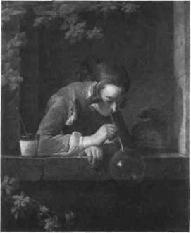 10. Жан-Батист-Симеон Шарден. Мыльные пузыри. Ок. 1745 г. Холст, масло. 93 х 74,6 см. Национальная художественная галерея, Вашингтон (дар г-жи Джон Симпсон) композиции. При этом законы живописного про странства действуют в равной мере и на плоскости, и в глубине картины. Со времен раннего Возро ждения зрители привыкли смотреть на любую кар тину как на окно в иную, иллюзорную реальность. Открытие перспективы, то есть системы практи ческих способов и приемов изображения простран ства на плоскости, совершило переворот в живо писи. Художники Ренессанса разработали теорию прямой центральной перспективы (так называемой научной, или линейной). Эта система предполагает наличие на горизонте одной неподвижной точки, в которой сходятся все ведущие в глубину диаго нальные линии. Ее использование позволяло ху дожникам убедительно изображать пейзаж — как природную, так и архитектурную среду, в которой развивалось действие. Знание законов перспективы давало возможность полностью контролировать все аспекты композиции, в том числе размеры и рас положение фигур. Многие живописцы выбирали перспективу «на глаз», без точных геометрических расчетов, но это, разумеется, не значит, что они просто переносили на полотно воспринимаемую зрением реальность. Успех знаменитой картины французского живопис ца Жана-Батиста-Симеона Шардена «Мыльные пу зыри» (илл. 10) объясняется в значительной мере искусным композиционным построением. Сам мотив был весьма популярен в жанровой живописи старых голландцев, где мыльные пузыри символи зировали непрочность и быстротечность человечес кой жизни и как следствие — тщету всего земного. Шарден таких задач себе не ставил: его полотно пленяет наивной простотой. Кажется, что интерес художника целиком сосредоточен на незамыслова том сюжете — он так же увлечен и поглощен этим зрелищем, как и присутствующие в картине дети. Согласно документальным свидетельствам, молодого человека Шарден писал с натуры и старался придать ему как можно более просто душный вид. Но саму картину никак нельзя назвать бесхитростной — ее композиция четко продумана. Фигура облокотившегося на парапет юноши образует треугольник, который придает всей структуре устойчивость и как бы останавливает изображенное художником мгновение. Равновесие композиции поддерживает выглядывающий из-за парапета ребенок, который завороженно смотрит на мыльный пузырь величиной почти что с его голову. В построении картины нет ничего случайного: так, изгиб ветки жимолости в левом верхнем углу в точности повторяет наклон спины героя, а обе соломинки — одна у него в руке, другая в стакане с мыльным раствором — образуют почти полную параллель. Даже трещина в каменном парапете несет композиционную нагрузку, концентрируя внимание на отставленном чуть в сторону стакане. Художники часто переносят на полотно не то, что видят, а то, что рисует им их собственное воображение. Но живописное пространство не за висит напрямую от исходного материала художника — реального или умозрительного; оно подчиняется собственным законам. Композиция «Моления о чаше» Эль Греко (илл. 11) построена на столкновении иррациональных и казалось бы несопоставимых элементов, которые, объединяясь, передают мистическое ощущение духовной кульминации, сопровождающей этот евангельский эпизод. В центре п