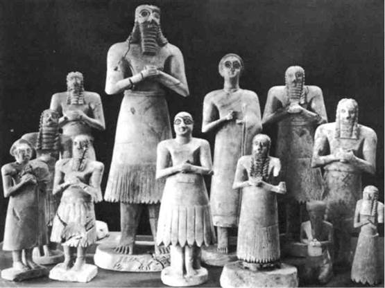 42. Статуи из храма Абу. Тель Асмар, ок. 2700—2500 г. до н. э. Мрамор; рост самой высокой фигуры 76,2 см. Иракский музей, Багдад и Восточный институт Чикагского университета ДРЕВНЕЕ ИСКУССТВО БЛИЖНЕГО ВОСТОКА • 55 минует наибольшее количество его углов. Другими словами, путь восхождения к божеству имеет форму прямоугольной спирали. Этот принцип «ломаной оси» представляет собой фундаментальную черту всей культовой архитектуры Месопотамии, резко отличающую ее от имеющих единственную, прямую ось египетских храмов (см. илл. 36). Скульптура Изображение божества, которому был посвящен «Белый храм», утрачено — по всей видимости, это небесный бог Ану. Но до нас дошли скульптурные изображения богов из других храмов. Группу фигур из Тель Асмара (илл. 41), современную пирамиде фараона Джосера, отличают геометрическая обоб щенность и экспрессия — черты, характерные для скульптуры раннединастического периода. Самая высокая из них (ок. 76 см) изображает Абу, бога растительного мира; другая, пониже — богиню мать; остальные фигуры принадлежат жрецам бо жеств и его поклонникам. Фигуры божеств выде ляются среди остальных не только ростом, но и большим размером глазных зрачков, хотя глаза непропорционально велики у всех персонажей. Со хранившиеся до наших дней цветные инкрустации делают их неподвижный, сосредоточенный взгляд особенно выразительным. По всей видимости, груп па предназначалась для целлы посвященного Абу храма, где фигуры людей и божеств взирали друга на друга, стоя лицом к лицу. Шумеры верили, что боги реально присутствуют в своих изображениях; статуи молящихся пред ставляли перед божеством конкретных людей, пе редавая ему их прошения и молитвы. Однако к портретному сходству скульпторы явно не стре мятся: тела и лица людей переданы упрощенно и схематично, так как внимание не должно от влекаться от самого важного — глаз, этих зеркал человеческой души. Если у египетских скульпторов в основе формы лежал куб, то у шумеров в этой роли выступали цилиндр и конус. Руки и ноги персонажей напоминают круглые в сечении трубы, а их длинные юбки словно выточены на токарном станке. Даже в эпохи более поздние, когда формы месопотамской скульптуры стали гораздо многооб разнее, эти изначальные ее черты заявляют о себе снова и снова. Строгий геометризм статуй из Тель Асмара характерен для искусства резчика, как бы «извле кающего» из каменной глыбы нужную ему форму. Гораздо более гибкий и реалистический стиль свойственен шумерской скульптуре, выполненной