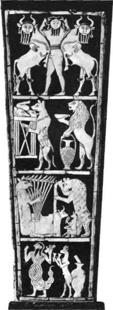 43. Баран и дерево. Подставка для приношений из Ура, ок. 2600 г. до н. э. Дерево, золото, лазурит; высота 50,8 см. Музей университета, Филадельфия в других техниках, где материал не «отсекается», а скорее «наращивается» — это и моделировка скульптуры в мягкой глине для последующей от ливки в бронзе, и комбинирование в ней разно родных материалов: дерева, золотых пластин, ла зурита. Несколько изделий такого рода, приблизи тельно современных фигурам из Тель Асмара, най дены в гробницах города Ура. Среди них и очаровательная фигурка, показанная на илл. 43: подставка для приношений в форме барана, ко торый стоит на задних ногах, опираясь передними о цветущее дерево. Баран выглядит удивительно живым и энергичным, и взгляд его, устремленный на нас сквозь ветки символического дерева, обла дает силой поистине демонической. И неудиви тельно — ведь животное это посвящено богу Там музу и воплощает, таким образом, мужское начало в природе. Обычай связывать тех или иных животных с определенными божествами тянется из глубокой древности. Мы встречаемся с ним не только в Месопотамии, но и в Египте (см. сокол бога Гора на илл. 28). В мифологии шумеров, однако, священные животные играют необычайно активную роль. К сожалению, большинство преданий этого народа не дошли до нас в письменной форме, и 56 • ДРЕВНЕЕ ИСКУССТВО БЛИЖНЕГО ВОСТОКА нам остается судить о них лишь по немногим изображениям, дразнящим своей загадочностью. Вот одно из них (илл. 44): инкрустированная панель арфы, найденная в Уре вместе с подставкой для приношений. В верхней сцене мы видим героя, обнимающего двух быков с человеческими голо вами — мотив в шумерском искусстве столь по пулярный, что трактовка его приобрела строго симметричный, условно-декоративный характер. Го раздо более живыми и естественными выглядят другие сцены, где действия, свойственные людям, выполняют звери: волк и лев несут напитки и кушанья на невидимый зрителю пир, а осел с оленем и медведем на этом пиру музицируют (осел играет на арфе, очень похожей на ту, что украшала некогда эта инкрустация). В нижней сцене козел и человек с туловищем скорпиона несут какие-то предметы, извлеченные ими из стоящего рядом большого сосуда. Чувствуется, что искусный мастер, создавший эти сцены, был связан изобразительными канонами гораздо в меньшей степени, чем его современники в Египте. Правда, и у него все фигуры выстроены на одной, изображающей землю, линии, но зато он не боится изображать плечи в ракурсе и позволяет фигурам частично заслонять друг друга. Но не будем ошибаться относительно его намерений: то, что кажется теперь очаровательной забавой, воспринималось некогда более чем серьезно. Увы, но историю, которую разыгрывают изображенные персонажи, мы так и не знаем! И все же мы с полным правом можем рассматривать их как самых ранних предшественников басен о животных -жанра, процветавшего на Западе в течение многих столетий от Эзопа до Лафонтена. А по крайней мере один из них — осел с арфой — стал впоследствии постоянным героем средневековой скульптуры. Вавилон К концу раннединастического периода теокра тический социализм шумерских городов-государств начал приходить в упадок. Правившие ими «на местники бога» стали фактически правящими мо нархами, и наиболее честолюбивые из них пытались расширить свою территорию, подчинив себе соседе