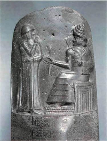 45. Верхняя часть стелы с текстом кодекса Хаммурапи. Ок. 1760 г. до н. э. Диорит, высота стелы 2,13 м; высота рельефа 71,1 см. Лувр, Париж