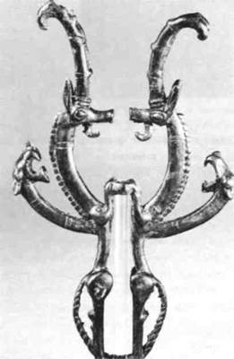 Кочевые племена не оставляют о себе ни архитектурных, ни письменных свидетельств, по этому проследить пути их миграции можно лишь внимательно изучая изделия, которые обнаружи вают в их захоронениях. Изделия эти, выполненные из дерева, кости или металла, представляют собой обычные предметы кочевого быта: оружие, конские уздечки, пряжки, броши и другие предметы укра шения, чаши, миски и т. д. Их находят на обширной территории от Сибири до Центральной Европы, от Ирана до Скандинавии. Помимо ювелирной плотности орнаментального рисунка объединяет эти предметы набор декоративных мотивов, известный под названием «анималистического стиля». Для этого стиля характерны изображения животных, выполненные в чрезвычайно условной и фантастической манере. Одним из мест, где зародился анималистический стиль, был древний Иран. Следы его мы обнаруживаем в небольших бронзовых изделиях из Луристана, относящихся к 9—7 вв. до н. э. В создании этих предметов ко