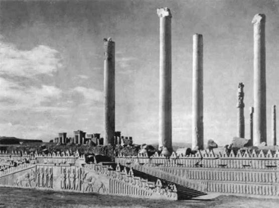 чевого обихода мастера проявили удивительную фантазию и изобретательность. Декоративное на вершие шеста (илл. 48) выполнено в виде двух симметричных фигур вставших на дыбы козерогов с неестественно удлиненными шеями и рогами. Мотив этот имеет, по всей видимости, свою исто рию. Мы подозреваем, что первоначально козерогов этих преследовала такая же симметричная пара львов. Впоследствии, однако, тела их слились с телами козерогов, а шеи последних вытянулись, придавая им сходство с драконами. Искусство эпохи Ахеменидов Покорив в 539 г. до н. э. Вавилон, персидский правитель Кир (ок. 600—529 г. до н. э.) унаследовал титул Вавилонского царя, и с ним и непомерные притязания ассирийских властителей. Основанная им держава продолжала расширяться и при его наследниках. Египет и Малая Азия очень скоро оказались под властью персов, и лишь чудом избежала этой участи Греция. В эпоху своего рас цвета, при Дарий I (ок. 550—486 до н. э.) и Ксерксе (519—465 до н. э.) персидская империя была гораздо обширнее своих египетских и ассирийских предшественниц вместе взятых. Больше того, ог ромное государство это просуществовало два сто летия — оно было разрушено Александром Маке донским (352—323 г. до н. э.) лишь в 331 г.— и все это время управлялось не только умело, но и гуманно. Каким образом удалось полудикому ко чевому племени достичь столь поразительных ре зультатов, остается только гадать. В течение жизни одного поколения персы не только освоили слож нейший механизм государственного управления, но и создали совершенно оригинальный монументаль ный стиль, достойно прославлявший величие их державы. Несмотря на свою удивительную способность к адаптации, персы сохранили собственные рели гиозные верования, источником которых служили пророчества Зороастра. В основе этих религиозных представлений лежало противостояние добра и зла, воплощенное в фигурах божества света Ахурамазды и божества тьмы Аримана. Поскольку культ Аху рамазды был сосредоточен вокруг священного огня, возжигаемого на специальных возводившихся на открытом воздухе алтарях, храмовой архитектуры персы не знали. Зато дворцы их были величест венными и поистине впечатляющими сооружени ями. Самый грандиозный из них был заложен Да рием I в г. Персеполисе в 518 г. до н. э. В ДРЕВНЕЕ ИСКУССТВО БЛИЖНЕГО ВОСТОКА • 61