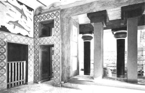 51. Покои королевы. Дворец Миноса, Кносс, Крит здается городская цивилизация, центрами которой является ряд огромных дворцов. По крайней мере три из них — в Кноссе, Фесте и Маллии — были возведены в короткий срок. В настоящее время от этого бурного строительства осталось немного следов, ибо примерно в одно и то же время — ок. 1700 г. до н. э. — все три дворца были разрушены. Через сотню лет на этих местах вновь появились такие же, и даже более грандиозные сооружения, но около 1500 г. до н. э. и их постигла та же судьба. Эти «новые» дворцы и являются главным ис точником наших сведения о минойской архитектуре. Один из них, стоявший в Кноссе и названный дворцом Миноса, отличался особым великолепием. Он был очень обширен и имел такое множество комнат, что вошел в греческую легенду как зна менитый лабиринт Минотавра. Сейчас, после тща тельных археологических раскопок, дворец частич но реставрирован. О том, как выглядело здание в целом, нам остается только гадать, хотя внешним величием оно, несомненно, уступало дворцам пер сидских и ассирийских владык (илл. 49). Создание монументального ансамбля не было целью его строителей. Большинство помещений дворца неве лики по размерам и имеют довольно низкие потолки (илл. 51), так что даже многоэтажные корпуса дворца вряд ли казались очень высокими. Зато многочисленные портики, лестницы, вен тиляционные каналы наверняка дарили обитателям здания приятное ощущение открытого воздуха и простора. Некоторые из его украшенных богатой стенной росписью помещений до сих пор радуют взгляд своим уютным изяществом. Каменная кладка дворцов повсюду очень качественная, но колонны всегда выполнены из дерева. И хотя ни одна из этих колонн не сохранилась, их характерная форма — гладкий, несколько сужающийся книзу ствол с широкой, в форме подушки, капителью — хорошо известна нам по скульптурным и живописным изображениям. Ни о происхождении этого типа колонны, который в определенной ситуации мог служить религиозным символом, ни о его возможных связях с архитектурой Египта нам ничего определенного неизвестно. ЭГЕЙСКОЕ ИСКУССТВО • 65 Живопись После катастрофы, стершей ранние постройки с лица земли, и столетия, которое понадобилось, чтобы от этой катастрофы оправиться, наступила пора экономического расцвета, сопровождавшегося настоящим взрывом творческой активности. И самым замечательным достижением этой блестя щей эпохи является, безусловно, ее живопись. К сожалению, до нас от нее дошли лишь небольшие фрагменты, и среди них почти ни одной компо зиции, не говоря уже о стенной росписи, которая сохранилась бы целиком. Главным предметом изо бражения были сцены с животными и птицами посреди роскошной растительности, а также раз личные обитатели моря. Интерес к жизни моря — о котором красно речиво говорит видная на илл. 51 фреска с изо бражением рыбы и дельфина — проявляли на Крите не только художники. Любовью к морю проникнуто все минойское искусство. Она ощуща ется даже в так называемой «Фреске с тореадо рами» (илл. 52) — самой большой и динамичной из обнаруженных до сих пор минойских стенных росписей. Только название это не нужно принимать всерьез: перед нами не бой быков, а ритуальная игра, участники которой вольтижируют на спине животного. Двое из изображенных на фреске строй ных атлетов — девушки: их, как и на Египетских фрес