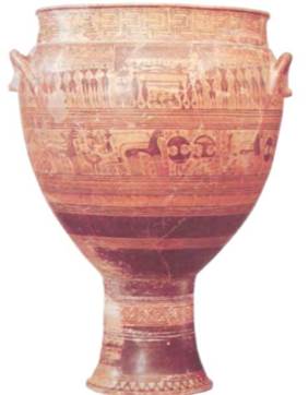 55. Ваза из Дипилона. 8 в. до н. э. Высота 108,3 см. Музей Метрополитен, Нью-Йорк. Фонд Роджерса, 1914 56. Прото-аттическая амфора с Горгонами и Ослеплением Полифема. Ок. 675—650 г. до н. э. Высота 142,2 см. Археологический музей, Элевсины 68 • ИСКУССТВО ГРЕЦИИ ионийцы, заселили Эгейские острова и побережье Малой Азии. Несколько столетий спустя они про никли и в западное Средиземноморье, основав ко лонии в Сицилии и южной Италии. Хотя язык и религия были у греков общими, старинное пле менное деление привело у них к созданию неза висимых городов-государств. Упорное соперничество между ними, непрерывная борьба за богатство, власть и влияние стимулировали активное развитие идей и государственных учреждений. За свою не способность к достижению компромиссов греки в конце концов дорого заплатили. Пелопонесская война (431—404 г. до н. э.), выигранная у Афин Спартой и ее союзниками, стала катастрофой, от которой Греции так и не суждено было оправиться. ЖИВОПИСЬ Период формирования греческой цивилизации включает четыре столетия — приблизительно с 1700 до 700 г. до н. э. О первых трех мы знаем очень мало, но уже где-то около 800 г. до н. э. греки решительно выступают на авансцену истории. К этому времени относятся первые известные нам достоверные исторические даты: это и 776 год — год первых олимпийских игр, отправная точка всей греческой хронологии — и даты основания ряда греческих городов, чуть более поздние. На это же время приходится расцвет самого раннего греческого художественного стиля — так на зываемого геометрического. Он известен нам лишь по росписям на глиняной посуде и мелкой пластике (монументальная архитектура и каменная скульптура появляются в Греции в седьмом веке). Геометрический стиль Поначалу единственным украшением посуды служил геометрический орнамент из квадратов, треугольников или концентрических окружностей. Однако к 800 г. до н. э. в узор абстрактного орнамента включаются фигуры людей и животных, которые в наиболее совершенных изделиях стано вятся персонажами тщательно скомпонованных сцен. Образец этого стиля, приведенный на илл. 55, найден на кладбище Дипилон в Афинах и при надлежит к большим вазам, которые устанавли вались на надгробиях. В его дне имеются отверстия, через которые стекали в могилу предназна ченные мертвецу жертвенные возлияния. На стенке сосуда мы видим выставленное для прощания тело покойного, по обеим сторонам которого стоят фи гуры с воздетыми в траурном жесте руками, а также погребальную процессию из пеших воинов и колесниц. Самым замечательным в этой сцене является отсутствие каких бы то ни было деталей, говорящих о загробной жизни; ее единственная задача — увековечить добрую память покойного. Вот лежит достойный человек,— словно говорит нам она — которого многие оплакивали и который был почтен пышным погребением. Может быть, греки вообще не верили в загробную жизнь? Верили, конечно; но царство мертвых было в их представлении некой лишенной определенных черт и красок страной, где души, или «тени» умерших вели жалкое, бездеятельное существование, не предъявляя к живущим никаких требований. Ориентализирующий стиль Элементы повествования и реалистического изображения на вазе из Дипилона (илл. 55) пол ностью отсутствуют. И не случайно: ведь ни те, ни другие не укладываются в консервативную традицию геометрического с