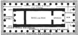 60. План типичного греческого периптерического храма (по Гриннелу) Планировка храмов Планировка греческого храма не связана на прямую с его ордером, который определяет лишь фасад здания. Она может быть очень различной в зависимости от размеров постройки и местных особенностей, но основные черты, тем не менее, настолько постоянны, что обобщенный «типичный» план (илл. 60) дает о ней прекрасное представление. Центром храма служит так называемая целла или наос (святилище) — помещение, где находилось изображение божества — и портик (пронаос) с двумя колоннами и обрамляющими их по обе стороны входа пилястрами (анты). Иногда, по соображениям симметрии, сзади к целле при страивался второй портик. В более крупных храмах