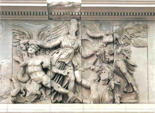 75. Голова мужчины. Остров Делос, ок. 80 г. до н. э. Бронза, высота 32,4 см. Национальный археологический музей, Афины просто немыслим. Первоначально портрет этот был не бюстом, а частью статуи, выполненной, по греческому обычаю, в полный рост. Кто изображен на портрете, нам неизвестно. Но кто бы он ни был, мы узнаем о его характере очень много: мягкие, несколько вялые черты лица; нерешительная, грустная линия рта, печальные глаза и изрезанный глубокими морщинами лоб — все выдает в нем человека, обуреваемого сомнениями и страхом, личность обыденную и отнюдь не героическую. В чертах его есть еще отблеск прежнего пафоса, но пафос этот передан теперь языком психологии. Конечно, люди непростого склада, обуреваемые внутренними противоречиями, были среди греков и раньше, точно так же как есть они и сейчас среди нас. Показательно, однако, что достоянием искусства этот сложный внутренний мир смог сделаться лишь на закате культурной и политической независимости греческого мира. Эту же лишенную нарочитой героизации че ловечность находим мы и в образе «Умирающего Галла» (илл. 76). Скульптура эта представляет собой римскую мраморную копию одной из брон ИСКУССТВО ГРЕЦИИ • 87 зовых статуй, которые царь Пергама (города на северо-западе Малой Азии) Аттал I повелел в 200 г. до н. э. изготовить в честь своей победы над вторгшимися в его страну галлами. Скульптор, видимо, знал галлов неплохо, так как этнические признаки — характерный тип лица и «ежиком» стоящие волосы — переданы им очень точно. Ожерелье на шее тоже очень характерно для кельтов. В остальном, однако, галл разделяет героическую наготу греческих воинов, вроде тех, что мы видели на фронтоне храма в Эгине (илл. 68). И хотя агония передана здесь не в пример реалистичнее, фигура умирающего по-прежнему исполнена пафоса и достоинства. К галлам явно относились как к достойным противникам. «Они хоть и варвары, но тоже умеют умирать»,— вот идея, которую призвана воплотить эта статуя. Но чувствуется в ней и что-то еще — то чисто животное, физиологическое страдание, которого мужские персонажи греческой скульптуры прежде никогда не знали. Смерть изображается здесь как конкретный физический процесс: галл, которому ноги больше не повинуются, из последних сил опирается на руку, словно сопротивляясь гнущей его к земле невидимой тяжести. Двумя десятилетиями позже мы становимся свидетелями нового расцвета пергамской скульп туры. Около 180 г. до н. э. сын и наследник Аттала I воздвигает на господствующем над городом холме в память отцовских побед колоссальный алтарь. Значительная часть его скульптурного убранства была открыта археологами и всю западную стену алтаря можно сейчас видеть в музее Берлина. Сюжет опоясывающего основание алтаря скульптурного фриза (илл. 77) — битва богов и гигантов — был для ионического фриза традиционным и уже знаком нам по Сифнийской сокровищнице (ср. илл. 67). В Пергаме, однако, ему придается новый смысл: победа богов призвана символизировать победы Аттала I. Такое переложение истории на мифологический язык было для греческого искусства не новостью: победы над персами, ска жем, изображались обычно как победы лапифов над кентаврами, или греков над амазонками. Но возвеличение правителя, сравнение его с богами, которое имеет в данном случае место, характерно не столько для греков, сколько для ц