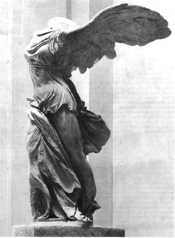 77. Афина и Алкионей. Деталь восточного фасада большого фриза алтаря Зевса в Пергаме, ок. 180 г. до н. э. Мрамор, высота 2,29 м. Музей Пергама, Берлин Македонским и унаследована затем правителями тех более мелких государств, на которые распалась его держава, в том числе и царями Пергама. Огромные фигуры фриза, высеченные так объемно, что почти отделяются от своего фона, не уступают по размерам и весу скульптурам фронтонов, но не скованы, подобно им, тесной треугольной рамой. Это слияние двух традиций — скульптуры фризовой и скульптуры фронтонной — стало триумфальной вершиной греческой монументальной скульптуры. Фигуры фриза, не отличаясь тонкой проработкой деталей, обладают зато колоссальной драматической силой. Охваченные пылом сражения мускулистые тела бойцов, сильные контрасты света и тени, могучие взмахи крыльев, раздувающиеся от ветра одежды — все буквально переполнено бьющей через край энергией, хотя в наши дни пафос произведения кажется несколько нарочитым и искусственным. Вся композиция, вплоть до ма лейшего локона, охвачена единым вихревым дви жением, связывающим победителей и побежденных в одном непрерывном ритме. Это единство дис циплинирует физический и эмоциональный накал схватки, не позволяя ей выплеснуться за свои архитектурные рамки. Не менее эффектное впечатление производит другой победный монумент начала второго века до н. э., так называемая Нике Самофракийская (илл. 78). Богиня опускается на нос корабля. Ее огромные крылья раскрыты навстречу еще несущему ее встречному ветру. Невидимая сила мощного потока воздуха здесь становится осязаемой реальностью. Она не только сообщает равновесие устремленной вперед фигуре богини, но и моделирует каждую складку ее волнующихся одежд. В результате между статуей и окружающим ее пространством возникает взаимодействие и даже взаимозависимость — чего никогда не было раньше и чему не скоро предстоит произойти вновь. Не случайно Нике Самофракийская пользуется славой величайшего шедевра эллинистической скульптуры. ИСКУССТВО ГРЕЦИИ • 89