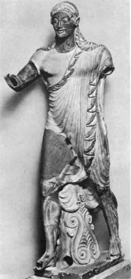 О ранней культуре этрусков мы знаем на удивление мало. По сообщению греческого исто рика классической эпохи Геродота их родиной была Лидия в Малой Азии, откуда впоследствии они и переселились в ту область между Флоренцией и Римом, что по сей день носит название Тосканы. Но на самом деле они могли появиться на земле Италии значительно раньше. Тогда неожиданный расцвет этрусской цивилизации после 700 г. до н. э. можно было бы считать результатом слияния коренного населения полуострова с небольшими, но активными группами мореплавателей из Лидии, прибывавшими в Италию в течение восьмого века до н. э. Но как бы то ни было, на авансцену истории Аппенинский полуостров вышел довольно поздно. Бронзовый век завершился здесь лишь в восьмом веке до н. э., примерно в то же время, когда в Сицилии и на юге Италии появились первые греческие поселения. В седьмом и шестом веках до н. э. этруски переживают пору политического расцвета — их власть распространяется на значительную часть центральной Италии. Но этруски, подобно грекам, так и не создали собст венного единого государства. Они всегда оставались непрочной федерацией городов-государств, вечно ссорящихся между собою и неспособных объеди ниться в борьбе против общего могущественного врага. В результате к концу третьего века до н. э. все они оказались под властью Рима — города, где некогда тоже правили цари-этруски. Мы так ничего и не узнали бы об этом народе из первых рук, если бы время не пощадило их искусно построенные гробницы. К нашему счастью, римляне, разрушая или перестраивая этрусские города, оставляли гробницы нетронутыми, что и позволило им неплохо сохраниться вплоть до наших дней. Скульптура Расцвет этрусской скульптуры хронологически совпадает с греческой архаикой. Именно в этот 79- Аполлон из храма Минервы в Вейях, ок. 510 г. до н. э. Терракота, высота 175,3 см. Национальный музей виллы Джулия, Рим ИСКУССТВО ЭТРУСКОВ • 91