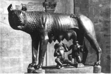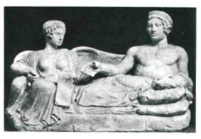 80. Волчица. Ок. 500 г. до н. э. Бронза, высота 85,1 см. Капитолийский музей, Рим период, особенно в конце шестого — начале пятого века до н. э., этрусское искусство переживает свой наиболее яркий период. Влияние греческой архаики оттеснило восточные элементы на второй план, но этрусские художники не превратились при этом в простых имитаторов греческих образцов. Работая в совершенно иной культурной среде, они сохранили свое ярко выраженное лицо. Свидетельством тому служит «Аполлон» на иллюстрации 79 — признанный шедевр этрусской скульптурной арха ики. Его могучее тело, прекрасно различимое под орнаментально уложенными складками струящегося одеяния, ер жилистые, мускулистые ноги, его быстрая, целеустремленная походка — все дышит выразительной силой, равно которой мы ничего не найдем в современных ему греческих статуях. Бронзовая фигура львицы, выкормившей Ромула и Рема, легендарных основателей Рима (илл. 80; детские фигурки принадлежат эпохе Ренессанса) тоже напоминает Аполлона своей внушающей ужас свирепостью и физической мощью. Гробницы и их декоративное убранство Как представляли себе этруски загробную жизнь, мы точно не знаем. Похоже, однако, что они считали гробницу местом обитания не только тела, но и души покойного (в противоположность египтянам, которые полагали, что душа после смерти странствует отдельно от тела, и чья по гребальная скульптура оставалась поэтому «неоду шевленной»). Быть может этруски думали, что, наполняя гробницу картинами пиров, игр, танцев и других подобных увеселений, они вселяют в душу умершего желание остаться в царстве мертвых и не тревожить живых своим появлением. Иначе чем объяснить великолепные стенные росписи их погребальных камер? На илл. 81 вы видите роспись гробницы Львиц из Тарквинии, изображающую двух танцоров в экстатической пляске. Как и в статуе Аполлона, страстная энергия их движений кажется по духу своему скорее восточной, нежели греческой. Особенно интересны прозрачные одежды женщины, через которые хорошо видно ее тело. Контрастные тона мужского и женского тела отвечают традиции, введенной египтянами двумя тысячелетиями прежде (см. илл. 45). В Греции же эта традиция привилась лишь ненамного раньше, чем была расписана эта гробница — первые следы ее мы обнаруживаем в вазовой росписи поздней архаики. Поскольку в самой Греции настенной живописи этого периода не сохранилось, настенные росписи этрусских гробниц интересны нам не только как местные памятники, но и как возможное эхо греческой настенной живописи, дающее нам об этой последней некоторое представление. К концу пятого века до н. э. взгляды этрусков на загробную жизнь стали, похоже, более слож ными и куда менее радужными. Эти изменения хорошо отражает крышка от погребальной урны, выполненная после 400 г. до н. э. из местного 92 • ИСКУССТВО ЭТРУСКОВ