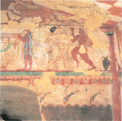81. Музыкант и два танцора. Деталь настенной росписи, ок. 480—470 г. до н э. Гробница Львиц, Тарквиния, Италия