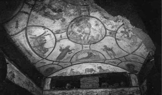 102. Роспись потолка. IV в. н. э. Катакомба, Свв. Пьетро и Марчеллино, Рим ность проживет еще долгую жизнь, только гречес кие и восточные элементы выступят на передний план за счет уменьшения значения собственно римского наследия. Поэтому византийская циви лизация так никогда и не станет в полном смысле средневековой. РАННЕХРИСТИАНСКОЕ ИСКУССТВО Вплоть до правления Константина Великого мало что можно с уверенностью сказать о хрис тианском искусстве. Единственным достаточно пол ным источником соответствующих сведений служат росписи римских катакомб, где находятся захоро нения ранних христиан. Но это, по-видимому, лишь одна из существовавших в то время разновидностей христианского искусства. Тогда Рим еще не был главным центром христианства. В больших городах Северной Африки и Ближнего Востока, таких как Александрия и Антиохия, существовали более старые и многочисленные христианские общины. Возможно, там христианское искусство развивалось в русле иных художественных традиций, но от него мало что сохранилось. Если нехватка материалов по восточным провинциям Римской империи мешает проследить тенденции развития христианского искусства в раннюю пору его существования, то сохранившаяся катакомбная живопись достаточно полно рассказывает нам о духовной жизни создавших ее общин. Катакомбы Погребальный ритуал и обеспечение безопас ности захоронений имели для первых христиан большое значение, поскольку их вера основывалась на ожидании вечной жизни в раю. Образный строй катакомбной живописи, как мы видим на илл. 102, где показана роспись потолка, наглядно отражает новое мировоззрение, хотя сами художественные формы остались прежними, типичными для до христианских настенных изображений. Пространст во потолка все так же делится на разграниченные ПО — РАННЕХРИСТИАНСКОЕ И ВИЗАНТИЙСКОЕ ИСКУССТВО участки — запоздалый и упрощенный отзвук ил люзионистических архитектурных композиций пом пейских росписей. Способ передачи фигур, а также пейзажные вставки наводят на мысль об их про исхождении от одного и того же прототипа. Однако в исполнении художника, обладающего весьма скромным дарованием, испытанный в римском ис кусстве прием не срабатывает: здесь он лишен своего исходного смысла. Но это мало заботит художника. Отвлекаясь от первоначального значе ния приема, живописец вкладывает в него новое символическое содержание. Здесь задействовано даже геометрическое членение потолка: большой круг явно символизирует небесный свод, на котором начертан крест — основной символ новой веры. В центральном медальоне мы видим молодого пастуха с овцой на плечах в позе, которая восходит еще к греческому искусству эпохи архаики. Он символизирует Христа-Спасителя, «Пастора Добро го», отдающего жизнь «за овцы своя». В полук ружиях, размещенных по периферии, находятся сцены, рассказывающие библейскую историю про рока Ионы. Слева показано, как Иону бросают с корабля в море, справа он выходит из чрева кита. Внизу мы видим его уже на суше — избавившись от опасности, он размышляет о милосердии Божьем. Этот ветхозаветный сюжет, часто сравниваемый с чудесами, описанными в Новом завете, был очень популярен в раннехристианском искусстве, под тверждая, что Господь властен спасти верующего от, казалось бы, неминуемой смерти. Стоящие фи гуры — это члены цер