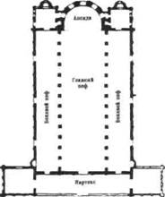 104. План церкви Сан-Апполинаре-ин-Классе (по Де Ангелис д'Оссат) и за несколько лет на деньги казны было создано невероятное количество больших церковных пост роек, причем не только в Риме, но и в Констан тинополе, в Палестине и других имевших важное значение местах. Церковь Сан-Аполлинаре-ин-Классе. Эти здания представляли собой новый тип сооруже ния — раннехристианскую базилику — послужив ший основой развития церковной архитектуры в Западной Европе. Раннехристианская базилика, как это видно на примере церкви Сан-Аполлинаре-ин Классе поблизости от Равенны (илл. 103, 104), представляет собой результат слияния архитектур РАННЕХРИСТИАНСКОЕ И ВИЗАНТИЙСКОЕ ИСКУССТВО -111