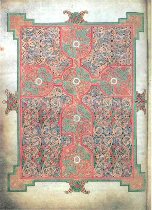118. Голова животного, найденная в ладье из захоронения в Осеберге. Ок. 825 г. Дерево, высота ок. 12,7 см. Институт истории искусства и классической археологии, Университет Осло щихся лент встречался и в древнеримском, и в раннехристианском искусстве, причем особенно часто — на южных берегах Средиземного моря. Но такое сочетание данного орнамента с изобра жениями в зверином стиле, как на детали кошеля из Саттон Ху, является новшеством, введенным незадолго до того времени, когда неизвестный художник взялся за эту работу. Особенно широко звериный стиль применялся для изделий из металла, которые отличались зна чительным разнообразием материала из которого выполнены и, как правило, очень высоким худо жественным уровнем мастерства. Именно такие украшения — небольшие, долговечные и бережно хранимые — объясняют причину быстрого рас пространения характерного для данного стиля на бора образов и постоянно воспроизводимых форм. Однако в эпоху раннего средневековья эти формы, образы и художественные приемы путешествовали не только из одной страны в другую; они проникали в смежные области искусства и стали применяться в резьбе по камню и кости, даже в книжной миниатюре. Произведения искусства, выполненные из дерева, дошли до нас в небольшом количестве. Они в основном происходят из Скандинавии, где звериный стиль просуществовал дольше всего. Относящаяся к началу IX в. деревянная голова фантастического животного на илл. 118 была найдена среди прочей оснастки в захороненном корабле викингов в Осеберге, на юге Норвегии, и служила носовым украшением. Подобно приве денным выше изображениям из Саттон Ху она отличается своеобразным соединением весьма раз нородных качеств. В целом форма головы доста точно реалистична. То же самое можно сказать о таких деталях, как зубы, десны и ноздри. Вместе с тем вся голова покрыта то переплетающимся, то геометрическим узором, применявшимся ранее на изделиях из металла. Такие оскалившиеся чудовища делали корабли викингов похожими на морских драконов из старинных сказаний. Раннесредневекоеое искусство Ирландии и Англии Черты, свойственные языческому германскому искусству и присущей ему разновидности звериного стиля, нашли отражение и в ранних произведениях, связанных с христианством, получивших распро странение к северу от Альп. Они изготовлялись ирландцами, которые в то время играли ведущую роль в духовной и культурной жизни Западной Европы. Период VII—IX вв. стоит назвать «золотым веком» Ирландии. В отличие от Британии она никогда не была частью Римской империи. Поэтому миссионеры, прибывшие туда в V в. из Британии, сочли ирландское общество по римским понятиям совершенно варварским. Ирландцы с готовностью приняли христианство, и оно ввело их в сопри косновение с цивилизацией Средиземноморья. Од нако это не сделало Ирландию страной проримской ориентации. Скорее можно сказать, что там при способили христианство к собственным нуждам при жестком соблюдении принципа своей незави симости. Уже сложившаяся организационная структура римско-католической церкви, ориентированная на существование городов, плохо подходила к стране, где их поначалу не было. Ирландские христиане предпочли избрать своим идеалом монахов-пустын ников Египта и Ближнего Востока, которые поже лали оставить развращенные города и удали