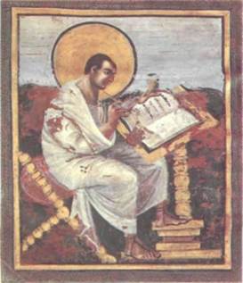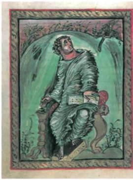 123. Св. Матфей. Миниатюра из Евангелия Карла Великого. Ок. 800-810 гг. 33 х 25,4 см. Художественно-исторический музей, Вена 124. Св. Марк. Миниатюра из Евангелия архиепископа Реимского Эбо. 816—835 гг. Муниципальная библиотека, Эперне, Франция понять, что представляли собой монастыри на протяжении всего средневековья. Рукописные книги и переплеты Сохранились упоминания о том, что во времена Каролингов церкви украшались настенными роспи сями, мозаиками и скульптурными рельефами, но до нашего времени от них почти ничего не осталось. С другой стороны, сохранилось достаточно большое количество иллюстрированных книг, изделий из слоновой или моржовой кости, произведений ювелирного искусства. Дух каролингского возрождения ощущается в них еще полнее, чем в остатках архитектурных сооружений. Когда мы смотрим на миниатюру с изображением Св. еван гелиста Матфея (илл. 123) из Евангелия, происхо дящего из Ахена и по преданию найденного в гробнице Карла Великого, но в любом случае тесно связанного с его двором, трудно поверить, что такая работа была выполнена на севере Европы около 800 г. Только большой золотой нимб не позволяет представить, что это портрет писателя эпохи античности. Кем бы ни был художник — византийцем, итальянцем или франком — у нас не вызывает сомнений его прекрасное знание традиций римской миниатюры, вплоть до орнамента в виде аканта вдоль широкой рамки, которая подчеркивает стремление автора показать, что это изображение является как бы окном в иной мир. Данная миниатюра относится к наиболее ор тодоксальному направлению в каролингском воз рождении. По своей сути она является своего рода аналогом переписываемых работ античных авторов, только в сфере изобразительного искусства. На миниатюре из Евангелия архиепископа Реимского Эбо (илл. 124) перед нами словно предстает образ времен античности, «переведенный» на художест венный язык каролингской эпохи. Св. евангелист Марк несколько напоминает нам сидящего на троне примерно в той же позе Христа с рельефа, пятью веками ранее украсившего саркофаг Юния Басса (см. илл. 108) — одна нога впереди, идущие по диагонали складки тоги в верхней части фигуры, правильные черты лица. Сходным образом решены также руки, одна из которых держит в первом случае свиток и во втором кодекс, тогда как другая — перо для письма, причем появившееся в более позднее время. Скорее всего, движение этой руки первоначально означало поясняющий жест. И еще: ножки в виде лап животных у высеченного на барельефе трона, на котором восседает Христос, имеют точно такую же форму, что и ножки сиденья Св. Марка. Однако, в отличие от рельефа миниатюра наполнена импульсами энергии, приводящей в движение все детали: и складки обвивающих фигуру одежд, и вздымающиеся холмы, и гнущиеся под порывами ветра ИСКУССТВО РАННЕГО СРЕДНЕВЕКОВЬЯ • 137