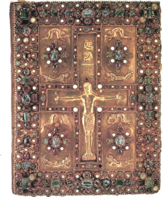 125. Оклад переплета Евангелия из Линдау. Ок. 870 г. Золото и драгоценные камни. 34,9 х 26,7 см. Библиотека Пирпонта Моргана, Нью-Йорк кусты и травы; и даже обрамляющий миниатюру орнамент из акантовых листьев приобретает какое-то необычное сходство с языками пламени. Что касается самого Евангелиста, он предстает перед нами уже не излагающим свои мысли римским писателем, а человеком, охваченным божественным вдохновением, орудием в руках Бога, с горячечным пылом записывающим Его Слово. Взгляд Апостола устремлен не на книгу, которую он пишет, а на служащего как бы посланцем для передачи текста священного писания крылатого льва со свитком (символ этого Евангелиста). Столь прямая и не посредственная зависимость от Божьей воли, от Бога-Слова знаменует появление нового, средневе кового понимания роли человека в противовес старому, античному. Что же до тех средств, кото 138 • ИСКУССТВО РАННЕГО СРЕДНЕВЕКОВЬЯ рыми достигается художественная выразительность данной миниатюры,— это относится в первую оче редь к динамизму линий, которого нет в миниатюре из Евангелия Карла Великого — то они вызывают в памяти полные страстного движения орнаменты ирландских рукописных книг (см. илл. 119). Стиль реймской школы можно почувствовать и в рельефных изображениях на украшенном дра гоценными камнями окладе Евангелия из Линдау (илл. 125), принадлежащего к третьей четверти IX в. Этот шедевр ювелирного искусства наглядно показывает, как замечательно были усвоены ис кусством каролингского возрождения доставшиеся ему в наследство кельтско-германские традиции работы с металлом. Полудрагоценные камни рас пределены по золотой поверхности изделия груп пами, причем они находятся не на ее уровне, а приподняты на удерживающих их лапках либо на относительно высоких креплениях, арчатых в ос новании, чтобы свет проникал и снизу, усиливая блеск и сияние. Любопытно, что в фигуре распятого Христа мы не находим даже намека на боль или смертную муку. Кажется, что он не висит, а стоит с распростертыми в скорбном жесте руками. Наделить его признаками свойственных человеку страданий было еще немыслимо, хотя арсенал выразительных средств был у мастера под рукой. Мы ясно видим это по тому, как красноречиво передают горе окружающие крест фигурки. жизни Европы усилилась: нормандский герцог Вильгельм Завоеватель стал королем Англии, в то время как другие предводители нормандцев пос тепенно вытеснили византийцев из южной Италии и арабов из Сицилии (см. стр. 146). Между тем, когда в 911 г. окончилась династия немецкой ветви Каролингов, политический центр Германии сместился в Саксонию. Правители из Саксонской династии (919—1024) сумели восстано вить сильную королевскую власть. Наиболее вы дающимся из них был Оттон I, считавший себя продолжателем каролингской императорской тра диции и с самого начала заявивший притязания на такую же державную власть, которой обладал Карл Великий. Женившись после завоевания Ломбардии на вдове короля Италии и получив «лан-гобардскую» корону, он распространил свою власть на большую часть Италии, и вступил в Рим, где в 962 г. папа возложил на его голову императорскую корону. Так была воссоздана империя, получившая позднее название «Священной Римской империи германской нации», возможно, ее следовало бы назвать «германской мечтой», ибо наследникам Оттона I так нико