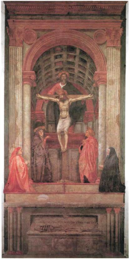 214. Мазаччо. Троица с Богоматерью, Иоанном Крестителем и двумя донаторами. 1425 г. Фреска. Церковь Санта-Мария Новелла, Флоренция 230 • РАННЕЕ ВОЗРОЖДЕНИЕ В ИТАЛИИ