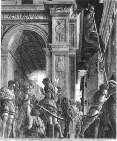 Капелла Оветари церкви Эремитани в Падуе. Разрушена в 1944 г. Раннего Возрождения. Его гениальность проявилась очень рано, и уже в 17 лет он мог выполнять самостоятельные заказы. В последующее десятиле тие Мантенья достиг творческой зрелости. Самое прославленное его творение — фрески в церкви Эремитани в Падуе, которые почти полностью по гибли во время бомбардировки в годы второй ми ровой войны. Наиболее драматичная из них — «Шествие Св. Иакова на казнь» (илл. 222), которая отличается необычным построением композиции (центральная точка схода перспективных линий находится в самом низу картины и несколько сме щена от центра вправо). В результате этого архи тектурный фон принимает угрожающие размеры, как в «Троице» Мазаччо (см. илл. 214). Огромная триумфальная арка, хотя и не является копией какого-либо известного римского памятника, даже в мельчайших деталях выглядит весьма достоверной. Здесь нашло отражение увлечение Мантеньи памятниками античности, которое сродни интересу археолога и свидетельствует о тесной связи худож ника с учеными-гуманистами из падуанского уни верситета, испытывавшими такое же благоговение перед каждым словом из античной литературы. Ни один из флорентийских живописцев или скульп торов того времени не мог оказать на него подо бного воздействия. Стремление к достоверности изображения можно увидеть и в одежде римских солдат (сравн. илл. 97); Мантенья даже использует здесь так называемый эффект «мокрых драпиро вок» — прием, заимствованный римлянами из классической греческой скульптуры (см. илл. 72). Однако, в напряженности худощавых и статных фигур и особенно в драматизме поз явно просле живается влияние Донателло. Сюжет фрески Ман теньи вряд ли требует столь экспрессивной трак товки. На пути к месту казни святой благословляет паралитика, повелевая ему встать на ноги и идти. Многие из присутствующих поражены этим чудом, что выражают взглядами и жестами. От толпы исходит огромное эмоциональное напряжение, ко торое в правой части композиции выливается в настоящую расправу, а закрутившееся в спираль РАННЕЕ ВОЗРОЖДЕНИЕ В ИТАЛИИ • 239 знамя словно отражает происходящее внизу бур ление. Беллини. Если Мантенья был мастером дра матически острых композиций, то его живший в Венеции зять, Джованни Беллини (ок. 1431—1516), проявил себя, прежде всего, как мастер света и цвета. Известность пришла к нему не сразу. Его лучшие картины, такие как «Экстаз Св. Франциска» (илл. 223), были написаны на рубеже XV и XVI веков. Изображенный здесь святой настолько мал по сравнению с окружающим пейзажем, что кажется незначительным, и все же его мистический восторг перед красотой материального мира передается и нам. Сняв деревянные башмаки, он стоит босиком на святой земле (см. стр. 43). В работе Беллини контуры не столь жесткие, как у Мантеньи, цвета мягче, а свет ярче. Интерес Бел лини к лирическому, наполненному светом пейзажу свидетельствует о влиянии великих нидерландских художников: в Венеции, имевшей прочные торговые связи с северными странами, работы этих худож ников вызывали неподдельное восхищение. Белли ни, несомненно, был знаком с творениями нидер ландских мастеров и разделял их внимательное и бережное отношение к малейшим деталям в изо бражении природы. В своей работе он придал нагромождению камней на переднем плане струк турную ясность 